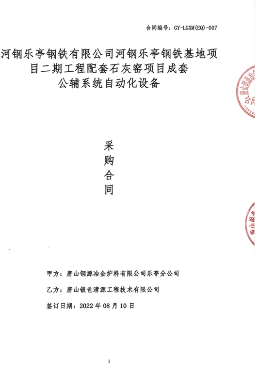 河鋼樂亭鋼鐵有限公司河鋼樂亭鋼鐵基地項(xiàng)目二期工程配套石灰窯項(xiàng)目成套公輔系統(tǒng)自動(dòng)化設(shè)備采購合同