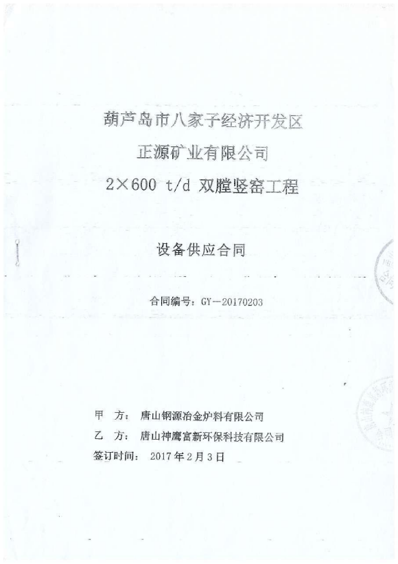 葫蘆島八家子正源礦業(yè)2×600t/d煤粉燃料雙膛豎窯工程,關(guān)鍵設(shè)備供貨、窯爐安裝指導(dǎo)等